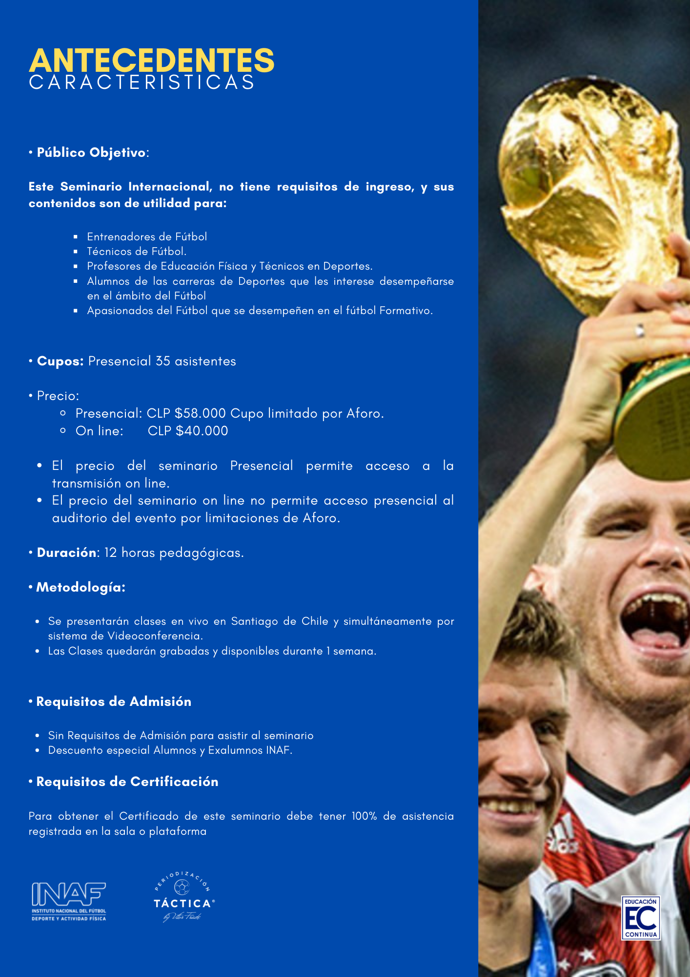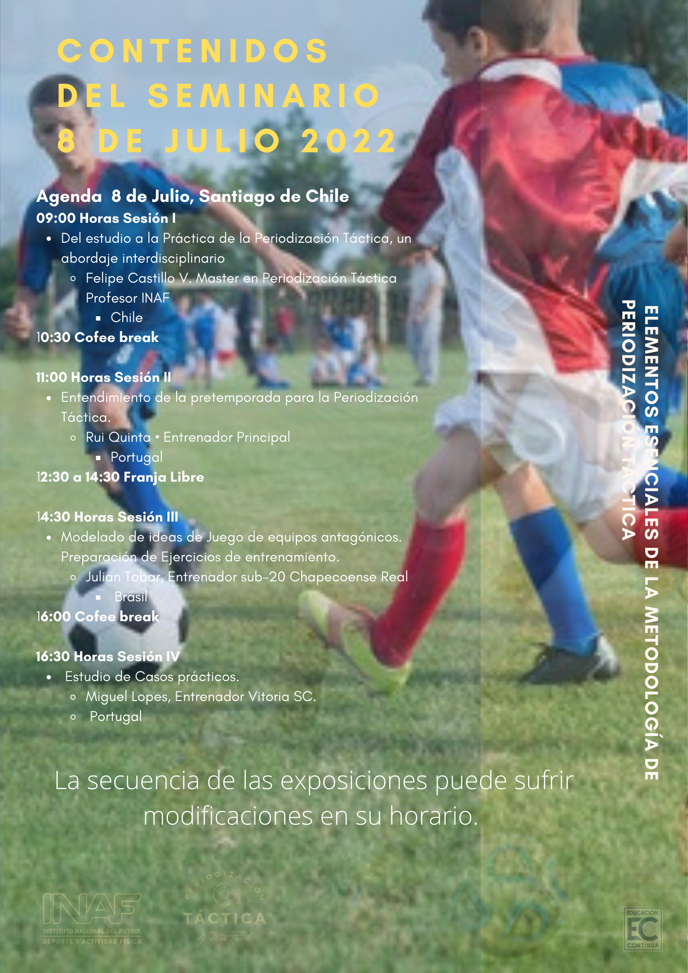 Este seminario denominado “Elememtos Esenciales de la Metodología de Periodización Táctica by Vitor frade ®”, es dictado en Chile y latinoamérica por la Escuela portugesa que tiene la tutela y los derechos del Maestro Vitor Frade para impartir su metodología desde la vista original de su creador. Quien supervisa y controla los contenidos que se entregan en esta materia.